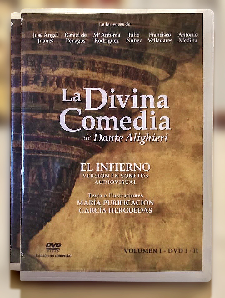 Obra audiovisual creada sobre «Aproximaciones a la Divina Comedia», basada en las ilustraciones de la autora y con las voces recitadas de JOSÉ ÁNGEL JUANES, RAFAEL DE PENAGOS, FRANCISCO VALLADARES, JULIO NÚÑEZ, MARÍA ANTONIA RODRÍGUEZ, ANTONIO MEDINA Y MIGUEL ÁNGEL DEL HOYO.